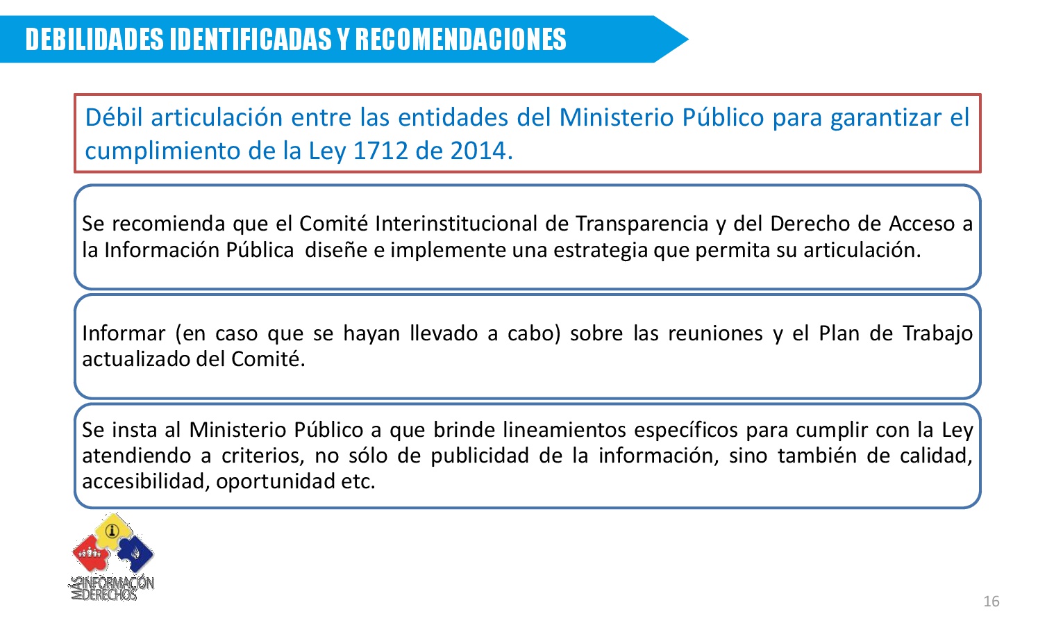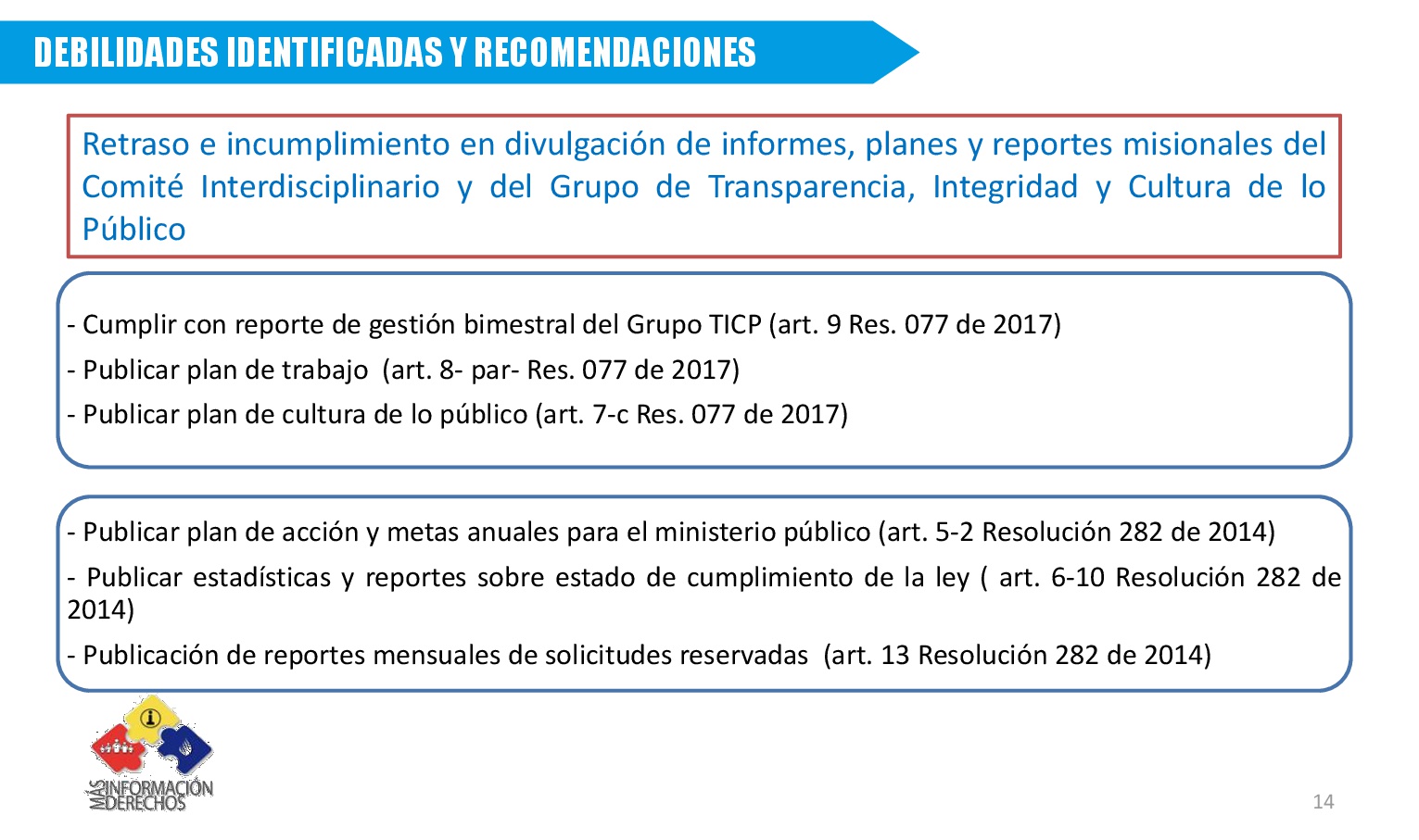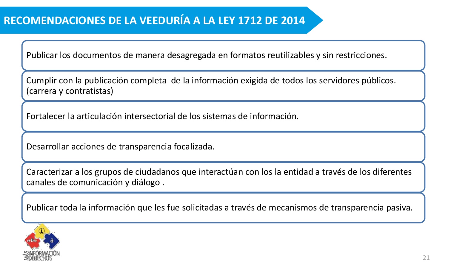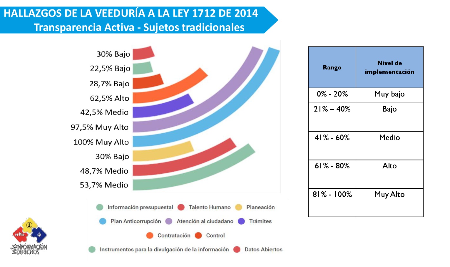Documentos del resumen de los resultados A continuación podrá descargar, en su orden, los siguientes resúmenes ejecutivos de  la veeduría ciudadana al cumplimiento  de la Ley de Transparencia y del Derecho de Acceso a la Información Pública: Avances en el seguimiento al cumplimiento de transparencia activa en entidades públicas y organizaciones políticas Informe de resultados de la veeduría al cumplimiento de las obligaciones de transparencia activa y pasiva por parte de las cuatro Altas Cortes y de la Fiscalía General de la Nación. Resumen ejecutivo del informe de resultados de la veeduría al cumplimiento de las obligaciones de transparencia activa y pasiva por parte de las cuatro Altas Cortes de la Fiscalía General de la Nación. Resumen ejecutivo de juventudes. Resultados de talleres de priorización temática y construcción de indicadores de seguimiento al cumplimiento de las medidas de prevención, protección y promoción. Informe de resultados de la veeduría al cumplimiento de las obligaciones de transparencia en el nombramiento de conjueces y en el trámite de impedimentos y recusaciones por parte de las cuatro Altas Cortes. Resumen ejecutivo del Informe de resultados de la veeduría al cumplimiento de las obligaciones de transparencia en el nombramiento de conjueces y en el trámite de impedimentos y recusaciones por parte de las cuatro Altas Cortes Informe de resultados de la veeduría a la existencia y calidad de la información incluida en los mecanismos de transparencia y rendición de cuentas exigidos por el artículo 236 de la Ley 1753 de 2015 + Evaluación del cumplimiento de…